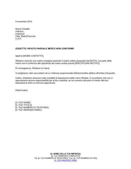 Modello Reclamo per Merce Difettosa - Modelli e Fac Simile Per essere valida dal punto di vista legale, la tua lettera di reclamo dovrà contenere i seguenti elementi. I tuoi dati personali. Bastano nome e cognome, indirizzo e partita Iva nel caso di un'azienda. L'oggetto. Devi far capire subito che si tratta di un reclamo per merce difettosa. Puoi aggiungere qui il numero della fattura relativa ... Corrispondenza commerciale come si scrive una lettera ... la lettera commerciale è il documento attraverso il quale avviene la normale comunicazione fra le aziende: essa, in particolare, associa il messaggio da trasmettere all'immagine del mittente e, pertanto, deve risultare curata in ogni suo aspetto, a garanzia di rapporti economici soddisfacenti e duraturi. è sbagliato ritenere che tali finalità … Lettera di vendita: ecco come scriverne una davvero efficace Se hai un prodotto o un servizio da vendere, è indispensabile preparare una lettera di vendita (o sales letter) per promuoverlo e invitare i potenziali clienti all'acquisto.. Va da sé che una lettera di vendita scritta in modo strategico avrà molta più possibilità di essere efficace, riuscendo quindi a generare un maggior numero di vendite e, di conseguenza, di guadagni. lettera di reclamo per merce mancante - Studio Savini Con la presente accettiamo le vostre modalità di pagamento e confermiamo che quest'ultimo avverrà per lettera di credito irrevocabile / vaglia postale internazionale / trasferimento bancario. Rifiuto merce non conforme - Basta riempire i spazzi vuoti e stampare in qualche minuto! Le consegne possono essere effettuate in Italia o zona Europa per le linee profumi.