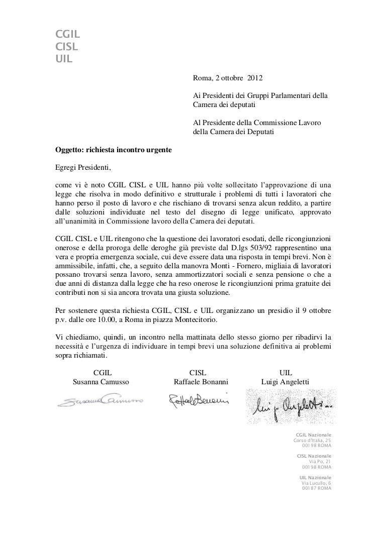 richiesta incontro sindacale fac simile - Studio Savini richiesta incontro sindacale fac simile, 2403-bis, 2° comma, del Cod. verbale accordo sindacale e azienda edile Buongiorno, le aziende edili (artigiane) secondo voi sono abbligate a firmare e presentare accordo sindacale per richiesta di cig con motivazione mancanza di lavoro. PDF Lettere Fac-simile - First Cisl Decreto Legislativo n. 81 del 9 aprile 2008 FORMAZIONE PER GLI RLS inviare a : Datore di Lavoro e p.c.: O.P.P. (data) Oggetto: Richiesta di essere inviato al corso di formazione per RLS/RLST/RLS di Sito Con riferimento all'art 50, comma 1, lett. g), all'art. 37, commi 4, 6, 10, 11 e 12, del D.Lgs. 81/2008, chiedo/iamo di essere inviato/i al più presto al corso di formazione previsto dagli ... Richiesta di incontro urgente | Rappresentanze Sindacali Unitarie Richiesta di incontro urgente | Rappresentanze Sindacali Unitarie, Richiesta di incontro urgente, Di seguito la lettera inviata via mail dalla RSU alla Delegazione trattante di parte pubblica UNIMI. RSU d'Ateneo, ——————————————————————————————————————————————, Al Magnifico Rettore, Prof. Gianluca Vago, Al Direttore Generale, Dott. Alberto Silvani, Lettera unitaria richiesta incontro urgente per cambi appalti Le scriventi Segreterie Regionali, con riferimento ai cambi appalto (lotto 30-31 Trenitalia Umbria Marche, lotto 1 Centostazioni Umbria, lotto16 Trenitalia passeggeri N/I ), vista l'indisponibilità dichiarata da parte dei soggetti subentranti (CPMA, Intini Source e Nord Servizi) a farsi carico di tutte le unità lavorative attualmente ...