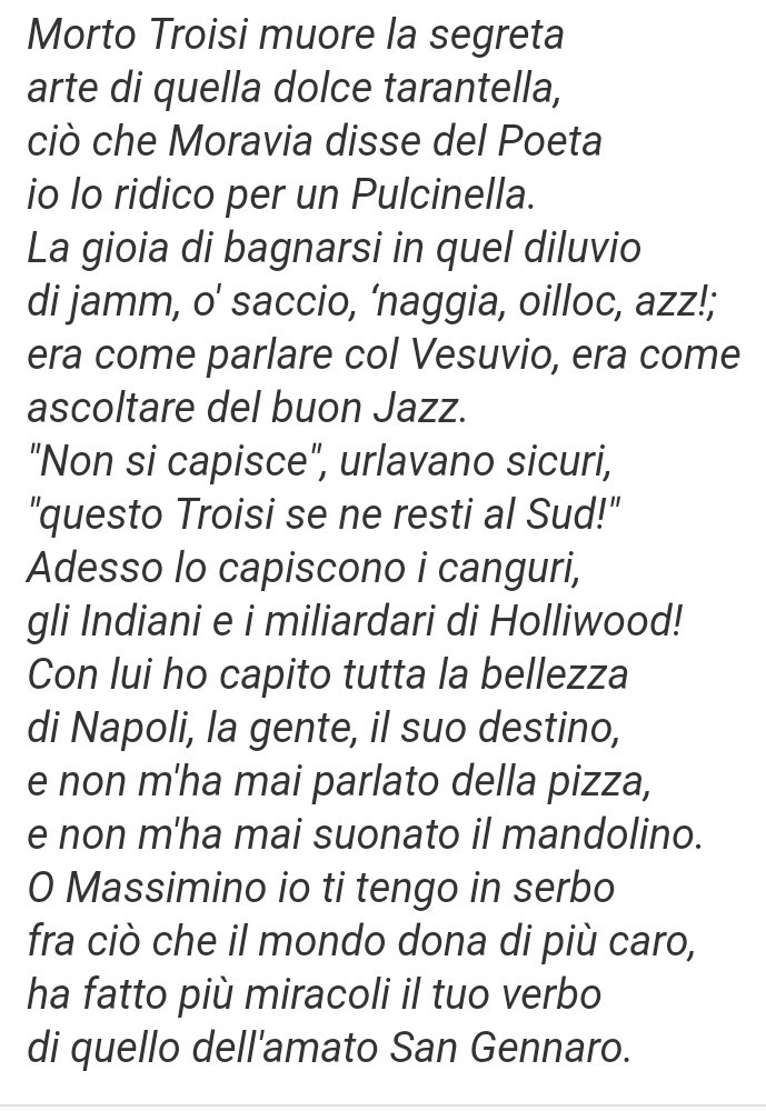 Lettera di benigni a troisi. Roberto Benigni - Wikipedia Roberto Benigni nel film Johnny Stecchino (1991). Nel 1988 incomincia una proficua collaborazione con lo scrittore e sceneggiatore Vincenzo Cerami in quattro pellicole da lui anche prodotte per la sua Melampo Cinematografica, fondata insieme a Nicoletta Braschi nel 1991, che ottengono uno straordinario successo di pubblico: nella prima, Il piccolo diavolo, recita al fianco di Walter Matthau ... Robinson - la Repubblica Robinson - libri, arte, cultura: recensioni, anteprime, eventi. Il settimanale culturale della domenica di Repubblica Non ci resta che piangere/ Su Rete 4 il film con Roberto ... 1 day ago · Non ci resta che piangere va in onda su Rete 4 dalle 21.25 di oggi, 2 gennaio. Il film è stato diretto da Roberto Benigni e Massimo Troisi, facenti parte del cast come personaggi principali. La ... Il postino - Wikipedia Il postino è un film del 1994 diretto da Michael Radford.. Il film è stato l'ultimo interpretato da Massimo Troisi, morto prematuramente poche ore dopo la fine delle riprese, ed è ispirato al romanzo Il postino di Neruda (Ardiente paciencia) dello scrittore cileno Antonio Skármeta